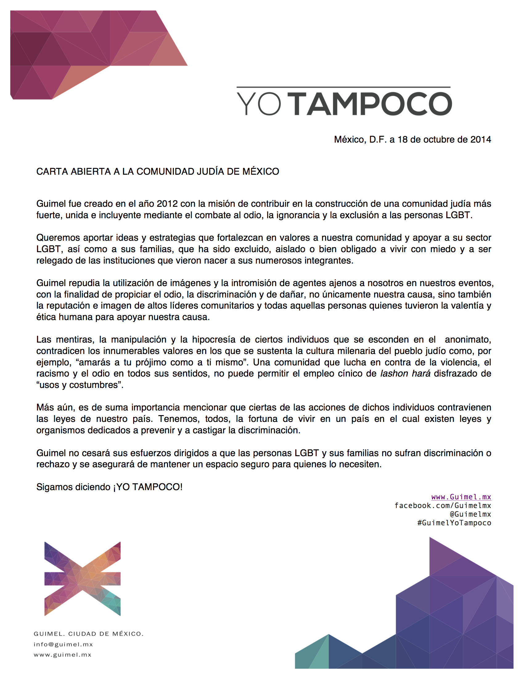 1. Lamento lo que sea que haya ocurrido con estas personas de falsa moral y creyentes de poseer la verdad absoluta. Todo fanatismo religioso ea tan perjudicial, como aquel avión de EL AL donde este tipo de personajes no quisieron sentarse junto a mujeres. No se vale ofender ni denigrar a nadie y menos a líderes y altruistas de la comunidad judía de México, sean idish, Halebis, Shamis, Sefaradim… (esto también, por cierto, es como del siglo II A.C. ) y muchísimo menos a sus familias. Repito como dije en face, hagan valer sus derechos de seres humanos, los cuales son iguales para todos, y si alguien esta contraviniendo los derechos propios de nuestro país ( la constitución ) que reciba todo el peso de la ley, ya tuvieron su opinión y sus patéticos 5 minutos de fama, propios de quien no es nadie. Esta es mi respetuosa (o no tan respetuosa ) opinión Sigan adelante, lo hacen maravillosamente bien!!! Siempre con el ánimo en alto, Uds están muy por encima de las mentes cerradas que ojalá y pronto entiendan el significado de la palabra A M O R y el amor en ninguna circunstancia puede ser malo y menos equivocarse. «Amarás a tu prójimo como a ti mismo» «Veajavta lereajá camoja» #YoTampoco Shana tova, un año lleno de salud, COMPRENSIÓN, amor y logros! Miriam Greenspun de Levental