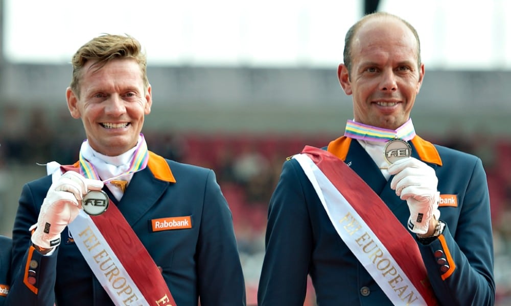 Hans Peter Minderhoud y Edward Gal posan con sus medallas de plata en el Campeonato Europeo FEI de Dressage en Dinamarca en el 2013 (Henning Bagger/AFP/Getty)